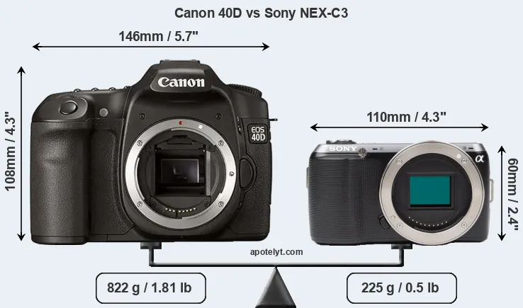 The physical size and weight of the Canon 40D and the Sony NEX-C3 are illustrated in the side-by-side display below. The two cameras are presented according to their relative size. Three consecutive perspectives from the front, the top, and the back are available. All width, height and depth dimensions are rounded to the nearest millimeter.