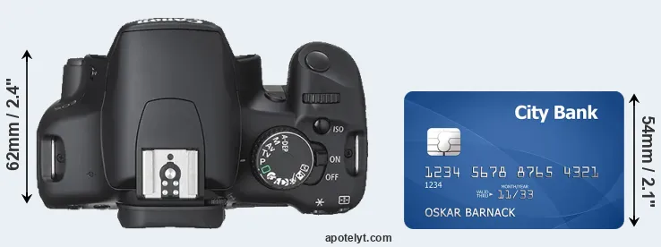 The side-by-side display below illustrates the physical size of the Canon 450D vis-à-vis a credit card. Three successive views from the front, the top, and the rear are shown. All width, height and depth dimensions are rounded to the nearest millimeter.