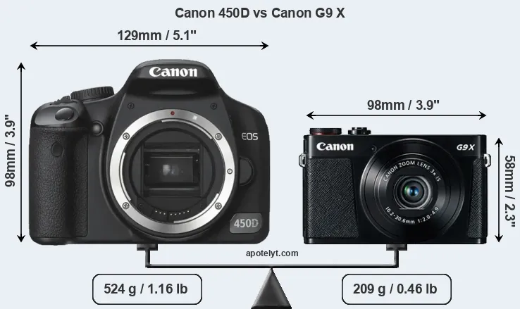The side-by-side display below illustrates the physical size and weight of the Canon 450D and the Canon G9 X. The two cameras are presented according to their relative size. Three successive views from the front, the top, and the rear are shown. All size dimensions are rounded to the nearest millimeter.