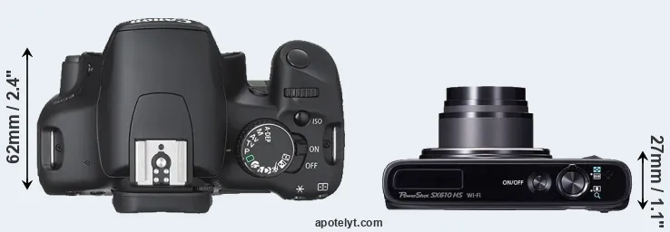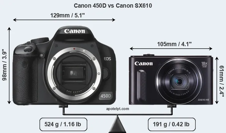 An illustration of the physical size and weight of the Canon 450D and the Canon SX610 is provided in the side-by-side display below. The two cameras are presented according to their relative size. Three successive views from the front, the top, and the rear are shown. All size dimensions are rounded to the nearest millimeter.