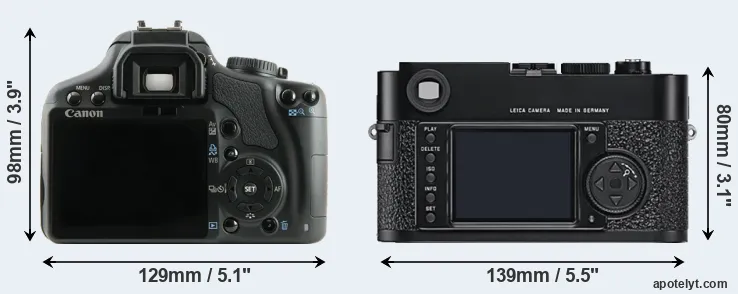 The above size and weight comparisons are to some extent incomplete since they do not consider the interchangeable lenses that both of these cameras require. A larger imaging sensor will tend to go along with bigger and heavier lenses, although exceptions exist. You can compare the optics available for the two cameras in the Canon EF Lens Catalog (450D) and the Leica M Lens Catalog (M9).