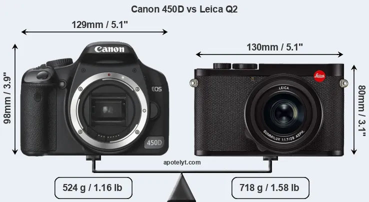 An illustration of the physical size and weight of the Canon 450D and the Leica Q2 is provided in the side-by-side display below. The two cameras are presented according to their relative size. Three successive views from the front, the top, and the rear are shown. All width, height and depth measures are rounded to the nearest millimeter.