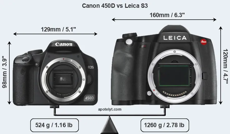Going beyond this snapshot of core features and characteristics, what are the differences between the Canon EOS 450D and the Leica S3? Which one should you buy? Read on to find out how these two cameras compare with respect to their body size, their imaging sensors, their shooting features, their input-output connections, and their reception by expert reviewers.