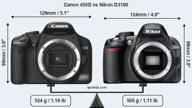 The side-by-side display below illustrates the physical size and weight of the Canon 450D and the Nikon D3100. The two cameras are presented according to their relative size. Three consecutive perspectives from the front, the top, and the back are available. All width, height and depth measures are rounded to the nearest millimeter.