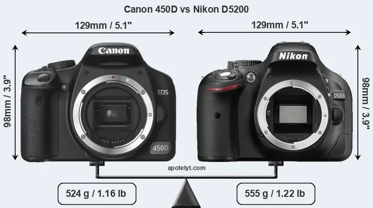 An illustration of the physical size and weight of the Canon 450D and the Nikon D5200 is provided in the side-by-side display below. The two cameras are presented according to their relative size. Three consecutive perspectives from the front, the top, and the back are available. All size dimensions are rounded to the nearest millimeter.