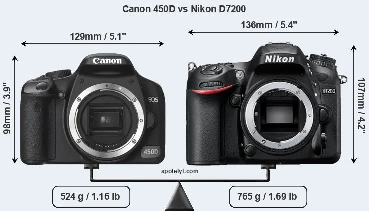 The side-by-side display below illustrates the physical size and weight of the Canon 450D and the Nikon D7200. The two cameras are presented according to their relative size. Three successive views from the front, the top, and the rear are shown. All width, height and depth measures are rounded to the nearest millimeter.