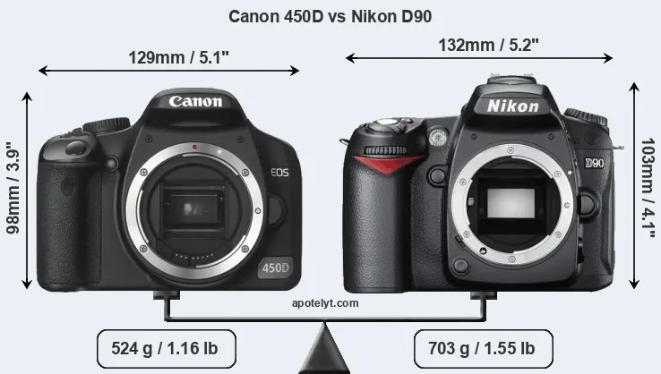 An illustration of the physical size and weight of the Canon 450D and the Nikon D90 is provided in the side-by-side display below. The two cameras are presented according to their relative size. Three consecutive views from the front, the top, and the rear side are shown. All width, height and depth measures are rounded to the nearest millimeter.