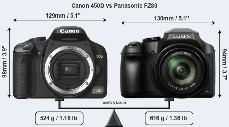 The side-by-side display below illustrates the physical size and weight of the Canon 450D and the Panasonic FZ80. The two cameras are presented according to their relative size. Three consecutive perspectives from the front, the top, and the back are available. All width, height and depth dimensions are rounded to the nearest millimeter.