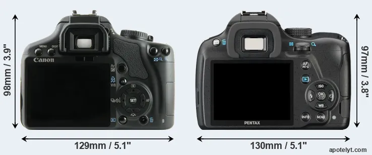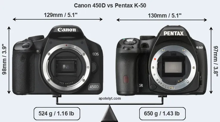 The side-by-side display below illustrates the physical size and weight of the Canon 450D and the Pentax K-50. The two cameras are presented according to their relative size. Three successive views from the front, the top, and the rear are shown. All width, height and depth dimensions are rounded to the nearest millimeter.