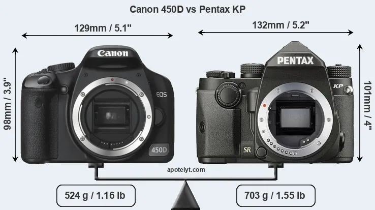 Going beyond this snapshot of core features and characteristics, what are the differences between the Canon EOS 450D and the Pentax KP? Which one should you buy? Read on to find out how these two cameras compare with respect to their body size, their imaging sensors, their shooting features, their input-output connections, and their reception by expert reviewers.