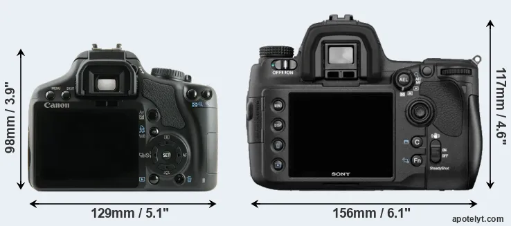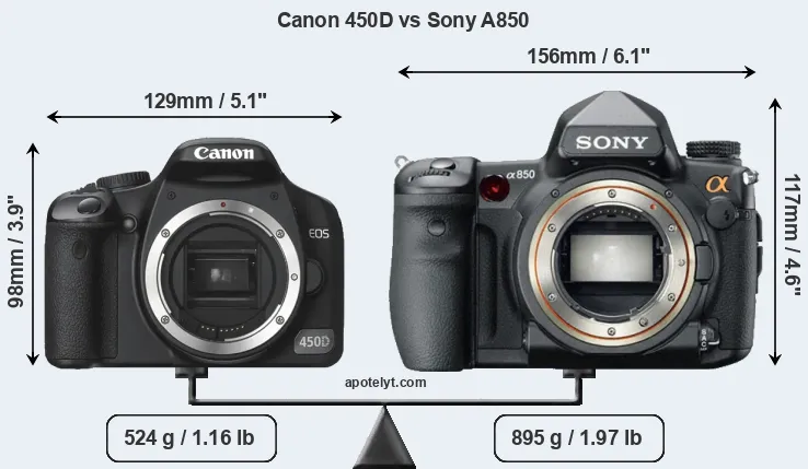 The side-by-side display below illustrates the physical size and weight of the Canon 450D and the Sony A850. The two cameras are presented according to their relative size. Three successive views from the front, the top, and the rear are shown. All size dimensions are rounded to the nearest millimeter.