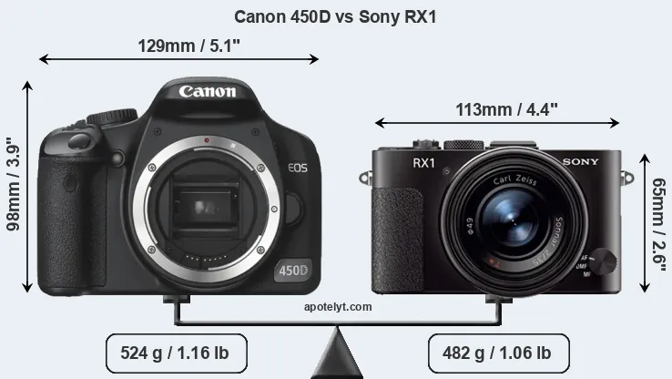 The side-by-side display below illustrates the physical size and weight of the Canon 450D and the Sony RX1. The two cameras are presented according to their relative size. Three successive views from the front, the top, and the rear are shown. All width, height and depth dimensions are rounded to the nearest millimeter.