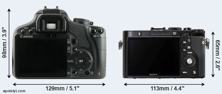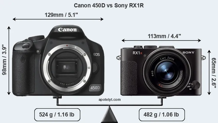 The side-by-side display below illustrates the physical size and weight of the Canon 450D and the Sony RX1R. The two cameras are presented according to their relative size. Three successive views from the front, the top, and the rear are shown. All width, height and depth dimensions are rounded to the nearest millimeter.