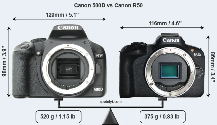 The side-by-side display below illustrates the physical size and weight of the Canon 500D and the Canon R50. The two cameras are presented according to their relative size. Three consecutive perspectives from the front, the top, and the back are available. All width, height and depth measures are rounded to the nearest millimeter.