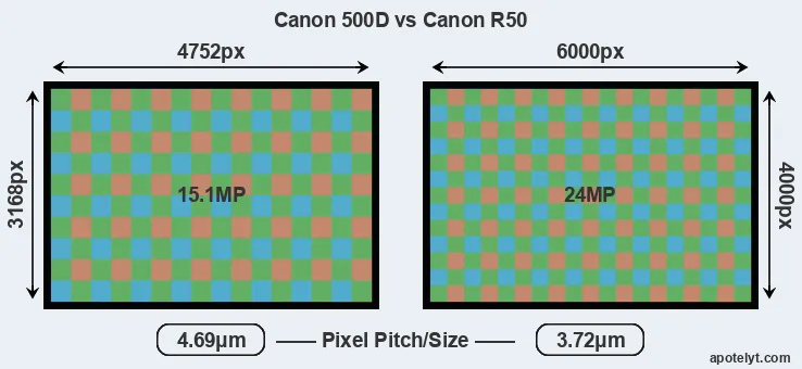 While the two cameras under review share the same sensor size, the R50 offers a higher resolution of 24 megapixels, compared with 15.1 MP of the 500D. This megapixels advantage translates into a 26 percent gain in linear resolution. On the other hand, these sensor specs imply that the R50 has a higher pixel density and a smaller size of the individual pixel (with a pixel pitch of 3.72μm versus 4.69μm for the 500D). However, it should be noted that the R50 is much more recent (by 13 years and 10 months) than the 500D, and its sensor will have benefitted from technological advances during this time that compensate for the smaller pixel size.