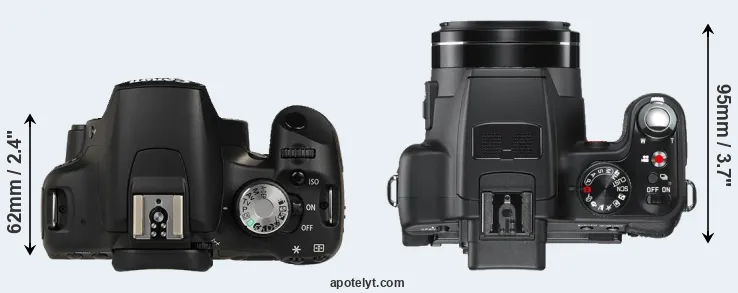 The side-by-side display below illustrates the physical size and weight of the Canon 500D and the Leica V-LUX 2. The two cameras are presented according to their relative size. Three consecutive views from the front, the top, and the rear side are shown. All width, height and depth measures are rounded to the nearest millimeter.