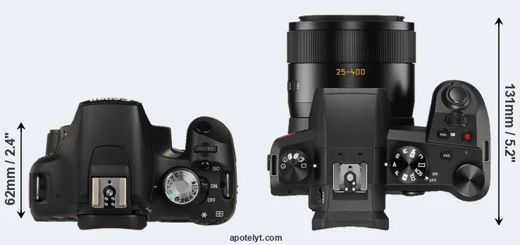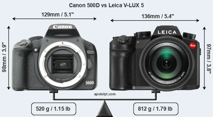 The physical size and weight of the Canon 500D and the Leica V-LUX 5 are illustrated in the side-by-side display below. The two cameras are presented according to their relative size. Three successive views from the front, the top, and the rear are shown. All size dimensions are rounded to the nearest millimeter.