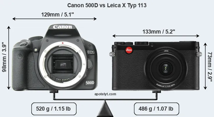 An illustration of the physical size and weight of the Canon 500D and the Leica X Typ 113 is provided in the side-by-side display below. The two cameras are presented according to their relative size. Three successive views from the front, the top, and the rear are shown. All width, height and depth dimensions are rounded to the nearest millimeter.