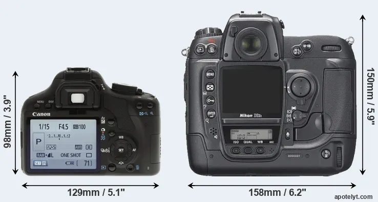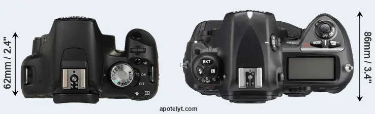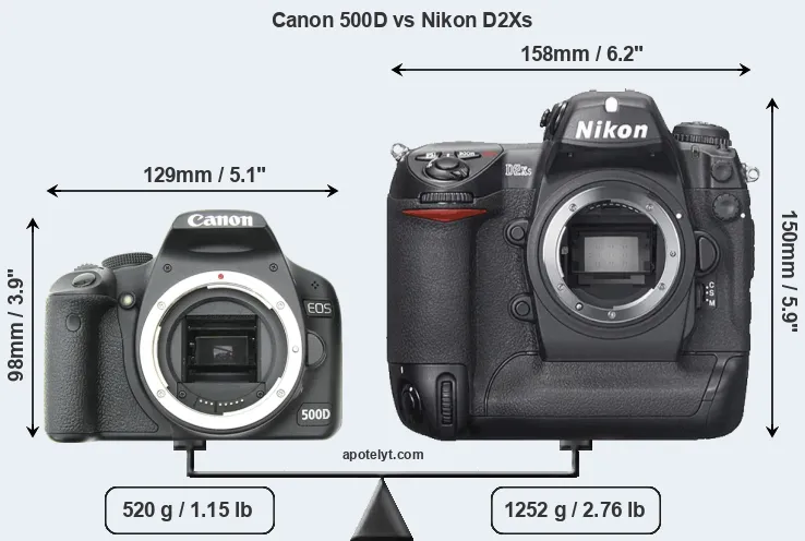 The side-by-side display below illustrates the physical size and weight of the Canon 500D and the Nikon D2Xs. The two cameras are presented according to their relative size. Three successive views from the front, the top, and the rear are shown. All size dimensions are rounded to the nearest millimeter.