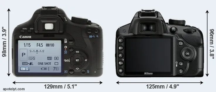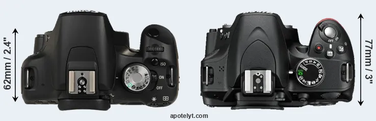 The physical size and weight of the Canon 500D and the Nikon D3200 are illustrated in the side-by-side display below. The two cameras are presented according to their relative size. Three consecutive perspectives from the front, the top, and the back are available. All width, height and depth dimensions are rounded to the nearest millimeter.