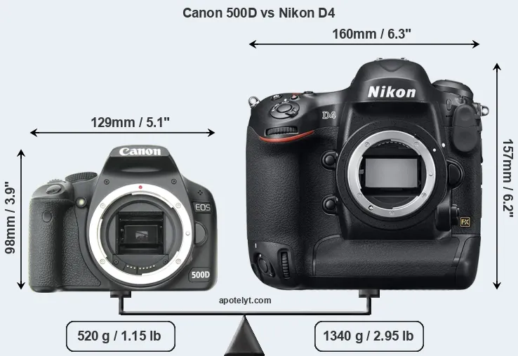 If the front view area (width x height) of the cameras is taken as an aggregate measure of their size, the Nikon D4 is considerably larger (99 percent) than the Canon 500D. Moreover, the D4 is substantially heavier (158 percent) than the 500D. It is noteworthy in this context that the D4 is splash and dust-proof, while the 500D does not feature any corresponding weather-sealing.