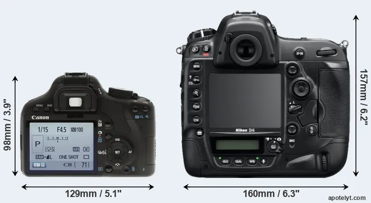 An illustration of the physical size and weight of the Canon 500D and the Nikon D4 is provided in the side-by-side display below. The two cameras are presented according to their relative size. Three consecutive views from the front, the top, and the rear side are shown. All width, height and depth measures are rounded to the nearest millimeter.