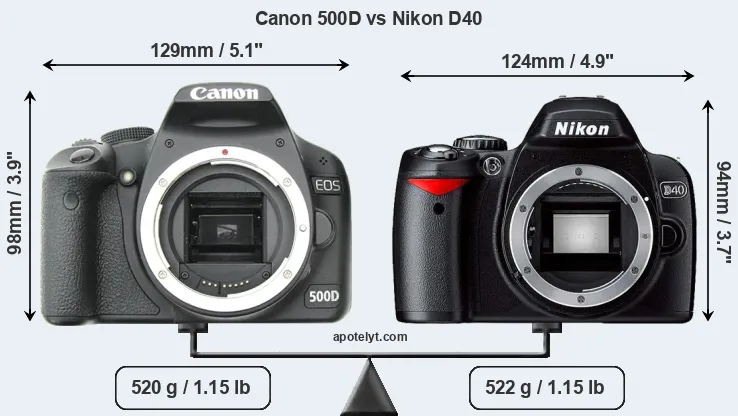 The physical size and weight of the Canon 500D and the Nikon D40 are illustrated in the side-by-side display below. The two cameras are presented according to their relative size. Three successive views from the front, the top, and the rear are shown. All width, height and depth dimensions are rounded to the nearest millimeter.