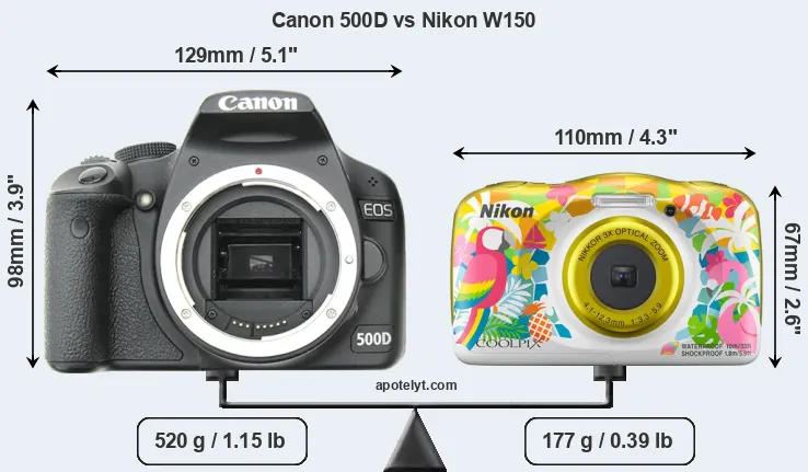 An illustration of the physical size and weight of the Canon 500D and the Nikon W150 is provided in the side-by-side display below. The two cameras are presented according to their relative size. Three consecutive perspectives from the front, the top, and the back are available. All size dimensions are rounded to the nearest millimeter.