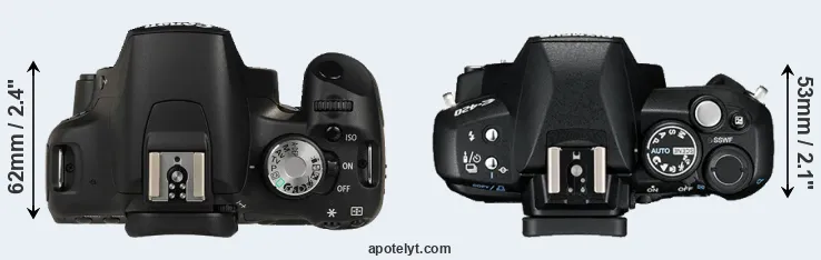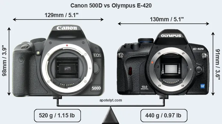 The physical size and weight of the Canon 500D and the Olympus E-420 are illustrated in the side-by-side display below. The two cameras are presented according to their relative size. Three consecutive perspectives from the front, the top, and the back are available. All width, height and depth dimensions are rounded to the nearest millimeter.