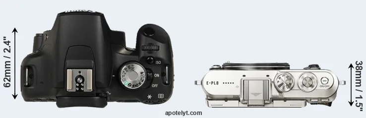 The side-by-side display below illustrates the physical size and weight of the Canon 500D and the Olympus E-PL8. The two cameras are presented according to their relative size. Three consecutive views from the front, the top, and the rear side are shown. All width, height and depth dimensions are rounded to the nearest millimeter.