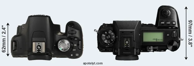 The side-by-side display below illustrates the physical size and weight of the Canon 500D and the Panasonic S1. The two cameras are presented according to their relative size. Three consecutive views from the front, the top, and the rear side are shown. All size dimensions are rounded to the nearest millimeter.