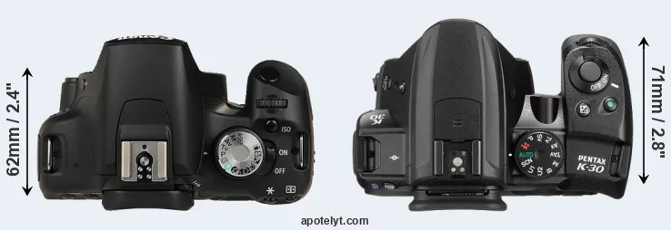 An illustration of the physical size and weight of the Canon 500D and the Pentax K-30 is provided in the side-by-side display below. The two cameras are presented according to their relative size. Three consecutive perspectives from the front, the top, and the back are available. All width, height and depth measures are rounded to the nearest millimeter.