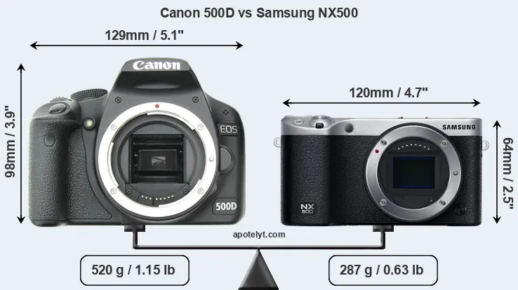 If the front view area (width x height) of the cameras is taken as an aggregate measure of their size, the Samsung NX500 is considerably smaller (39 percent) than the Canon 500D. Moreover, the NX500 is substantially lighter (45 percent) than the 500D. In this context, it is worth noting that neither the 500D nor the NX500 are weather-sealed.