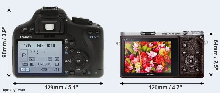 Going beyond this snapshot of core features and characteristics, what are the differences between the Canon EOS 500D and the Samsung NX500? Which one should you buy? Read on to find out how these two cameras compare with respect to their body size, their imaging sensors, their shooting features, their input-output connections, and their reception by expert reviewers.