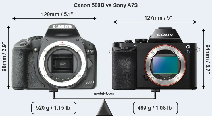 The physical size and weight of the Canon 500D and the Sony A7S are illustrated in the side-by-side display below. The two cameras are presented according to their relative size. Three consecutive views from the front, the top, and the rear side are shown. All width, height and depth measures are rounded to the nearest millimeter.