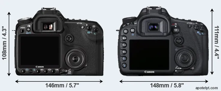 An illustration of the physical size and weight of the Canon 50D and the Canon 7D is provided in the side-by-side display below. The two cameras are presented according to their relative size. Three consecutive perspectives from the front, the top, and the back are available. All width, height and depth measures are rounded to the nearest millimeter.