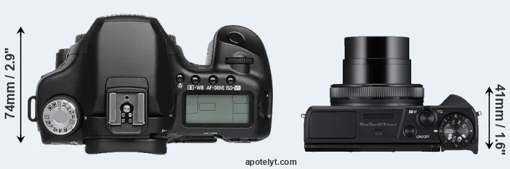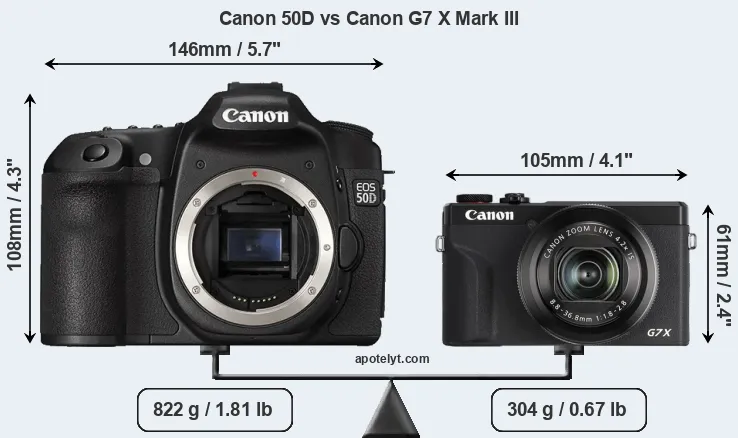 The side-by-side display below illustrates the physical size and weight of the Canon 50D and the Canon G7 X Mark III. The two cameras are presented according to their relative size. Three consecutive perspectives from the front, the top, and the back are available. All width, height and depth measures are rounded to the nearest millimeter.