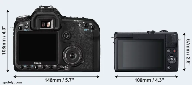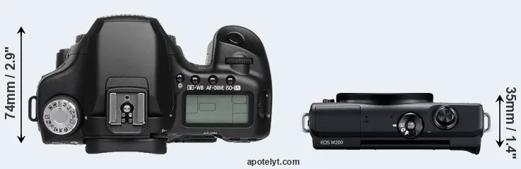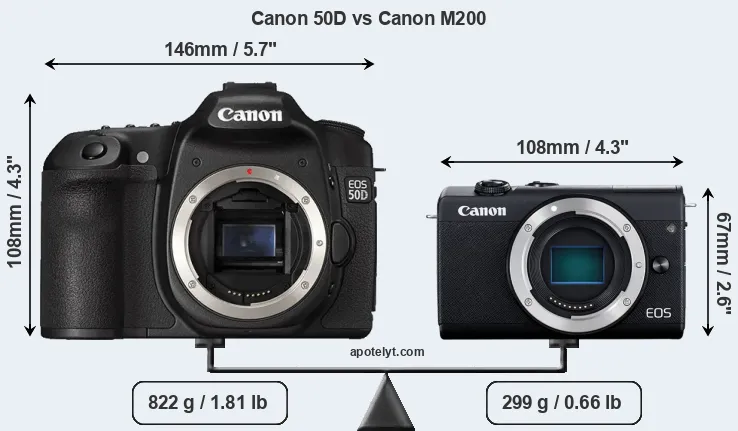 The side-by-side display below illustrates the physical size and weight of the Canon 50D and the Canon M200. The two cameras are presented according to their relative size. Three consecutive perspectives from the front, the top, and the back are available. All size dimensions are rounded to the nearest millimeter.