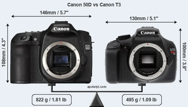 If the front view area (width x height) of the cameras is taken as an aggregate measure of their size, the Canon T3 is notably smaller (18 percent) than the Canon 50D. Moreover, the T3 is substantially lighter (40 percent) than the 50D. It is worth mentioning in this context that the 50D is splash and dust resistant, while the T3 does not feature any corresponding weather-sealing.