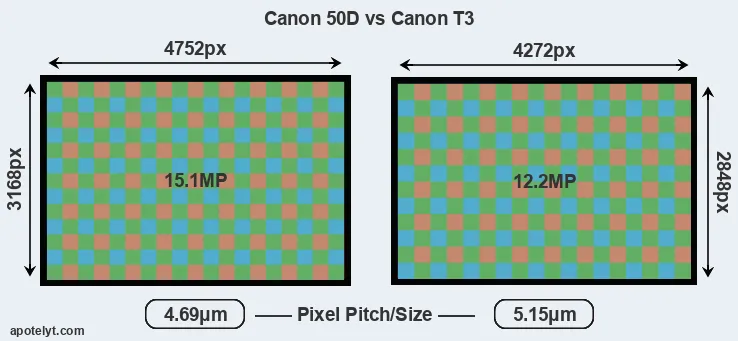 With 15.1MP, the 50D offers a higher resolution than the T3 (12.2MP), but the 50D has smaller individual pixels (pixel pitch of 4.69μm versus 5.15μm for the T3). Moreover, the T3 is a much more recent model (by 2 years and 5 months) than the 50D, and its sensor will have benefitted from technological advances during this time that enhance the light gathering capacity of its pixels.