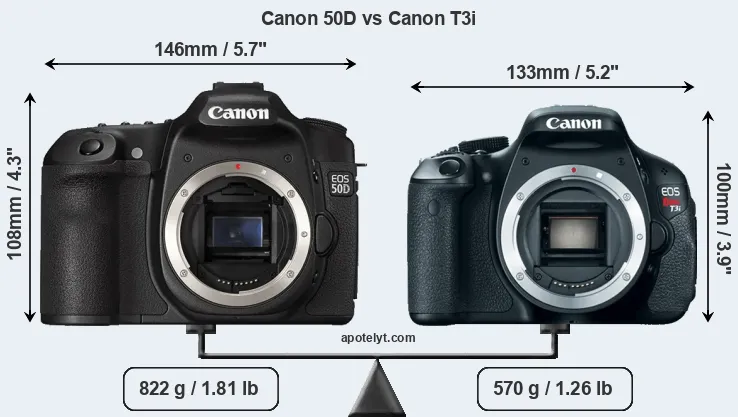 An illustration of the physical size and weight of the Canon 50D and the Canon T3i is provided in the side-by-side display below. The two cameras are presented according to their relative size. Three successive views from the front, the top, and the rear are shown. All width, height and depth measures are rounded to the nearest millimeter.