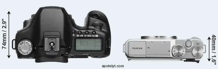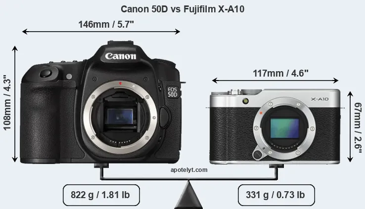 The side-by-side display below illustrates the physical size and weight of the Canon 50D and the Fujifilm X-A10. The two cameras are presented according to their relative size. Three consecutive perspectives from the front, the top, and the back are available. All width, height and depth dimensions are rounded to the nearest millimeter.