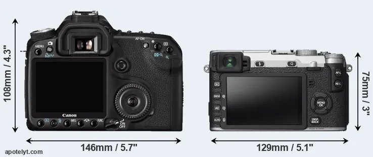 The physical size and weight of the Canon 50D and the Fujifilm X-E2S are illustrated in the side-by-side display below. The two cameras are presented according to their relative size. Three consecutive views from the front, the top, and the rear side are shown. All width, height and depth dimensions are rounded to the nearest millimeter.