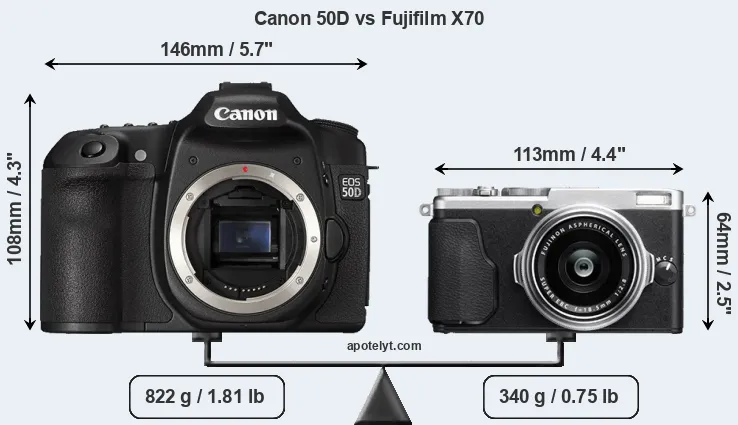 The side-by-side display below illustrates the physical size and weight of the Canon 50D and the Fujifilm X70. The two cameras are presented according to their relative size. Three consecutive views from the front, the top, and the rear side are shown. All width, height and depth dimensions are rounded to the nearest millimeter.