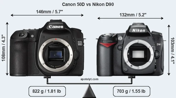 The side-by-side display below illustrates the physical size and weight of the Canon 50D and the Nikon D90. The two cameras are presented according to their relative size. Three successive views from the front, the top, and the rear are shown. All width, height and depth dimensions are rounded to the nearest millimeter.