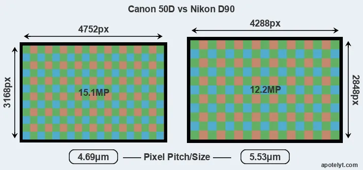 Despite having a smaller sensor, the Canon 50D offers a higher resolution of 15.1 megapixels, compared with 12.2 MP of the Nikon D90. This megapixels advantage comes at the cost of a higher pixel density and a smaller size of the individual pixel (with a pixel pitch of 4.69μm versus 5.53μm for the D90). It is noteworthy in this context that the two cameras were released in close succession, so that their sensors are from the same technological generation.