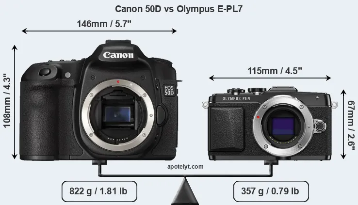 An illustration of the physical size and weight of the Canon 50D and the Olympus E-PL7 is provided in the side-by-side display below. The two cameras are presented according to their relative size. Three successive views from the front, the top, and the rear are shown. All size dimensions are rounded to the nearest millimeter.