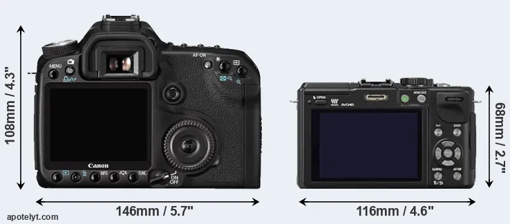 The side-by-side display below illustrates the physical size and weight of the Canon 50D and the Panasonic GX1. The two cameras are presented according to their relative size. Three consecutive perspectives from the front, the top, and the back are available. All width, height and depth measures are rounded to the nearest millimeter.