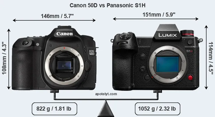 An illustration of the physical size and weight of the Canon 50D and the Panasonic S1H is provided in the side-by-side display below. The two cameras are presented according to their relative size. Three consecutive perspectives from the front, the top, and the back are available. All width, height and depth dimensions are rounded to the nearest millimeter.