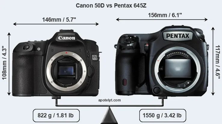 The physical size and weight of the Canon 50D and the Pentax 645Z are illustrated in the side-by-side display below. The two cameras are presented according to their relative size. Three consecutive views from the front, the top, and the rear side are shown. All size dimensions are rounded to the nearest millimeter.